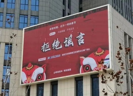菏泽市广告协会积极落实国家卫健委、中广协的指示精神,根据自身优势,第一时间调动优质户外媒体资源,组织相关人员积极参与到疫情防控宣传大战中,于1月27日在菏泽市区154个乡镇邮政网点,55个住宅小区门口,牡丹区委广场、中华路、八一路、东方红大街、火车站、巨野县汽车站、佳和购物广场及部分县区主要街道刊播防控新型冠状病毒感染的肺炎疫情公益宣传230处,提醒市民做好科学防护,不造谣、不信谣、不传谣。总发布费用达50余万元。