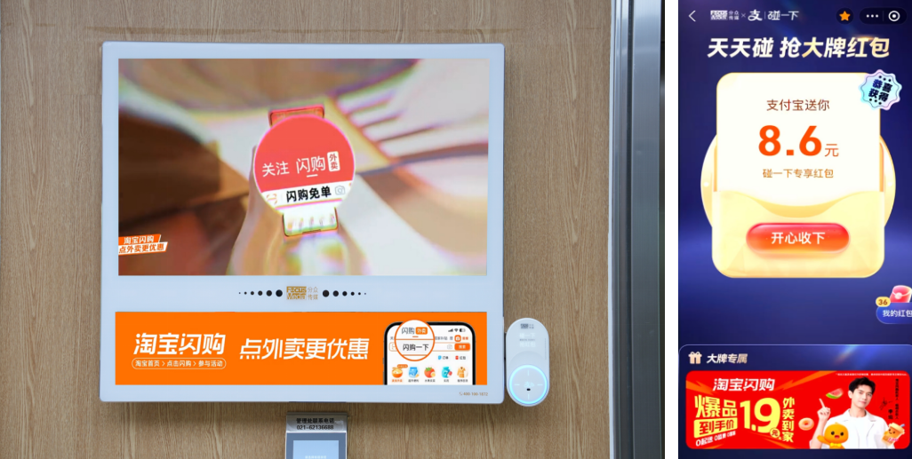 据介绍,分众在电梯屏幕旁安装支付宝“碰一下”蓝色圆环,构建起连接消费者与商业资源的全新交互入口,消费者通过手机“碰一下,抢红包”即可领取1亿现金红包,1000万份淘宝闪购免单和各类优惠券。目前,这一创新模式正在全国20多座城市的电梯间快速铺开。