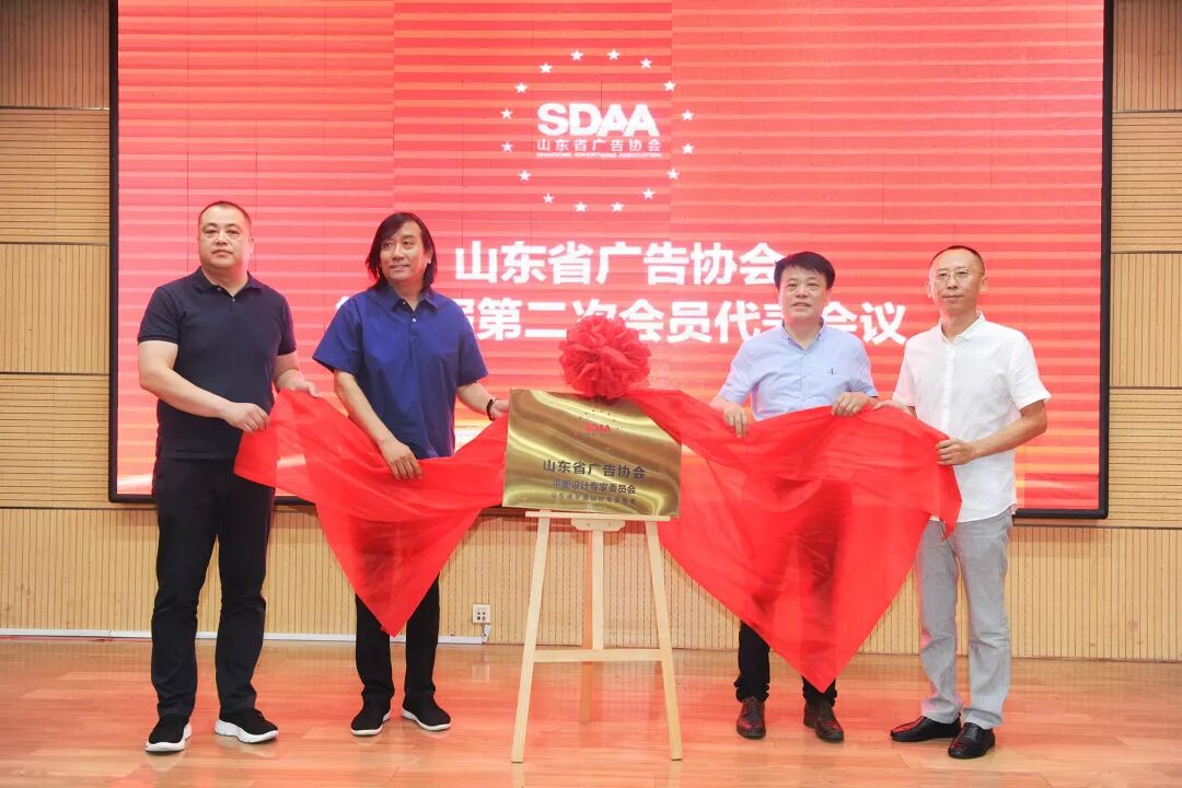 (平面设计专家委员会揭牌仪式从左起:山东工艺美术学院视觉传达设计学院院长、教授 孙大刚,山东工艺美术学院党委副书记、教授 苗登宇,省政协常委、中国广告协会副会长、山东省广告协会会长王百忠,山东省国际广告有限公司总经理李勇)